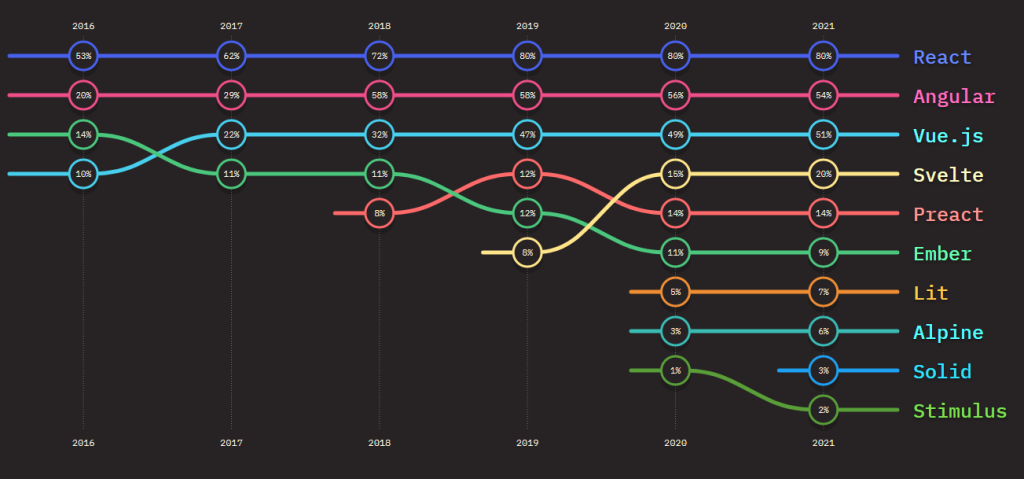 위의 이유 때문에, 리액트는 5년 연속 가장 각광받는 Front-end 라이브러리가 되었다.