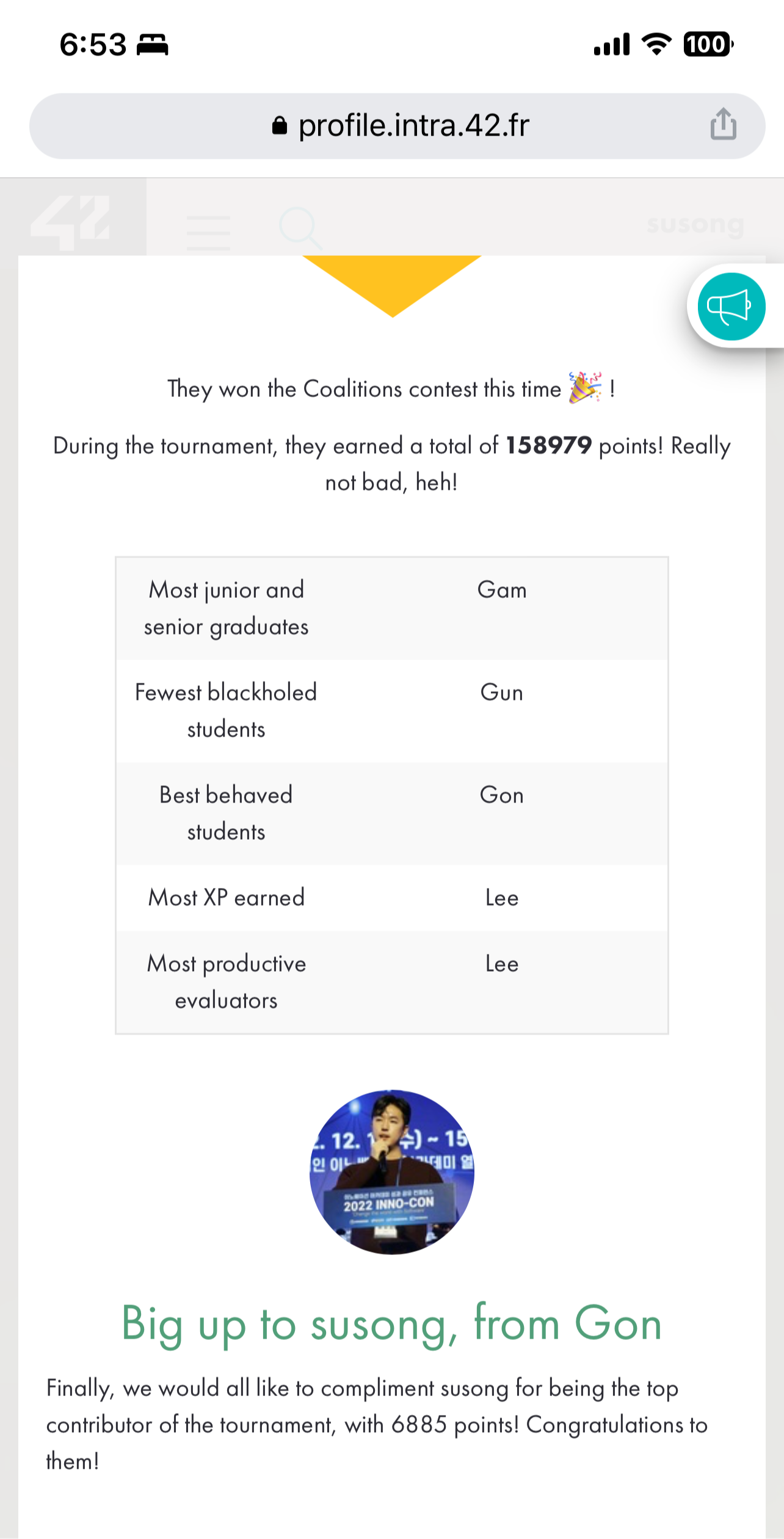 42서울에는 코알리숑이라는 제도가 있다. 이 제도는 (마치 해리포터의 그리핀도르, 스미드린 처럼) 42서울 내 구성원들 간에 팀과 소속감을 가지고 서로 선의의 경쟁을 부추기기 위해 존재한다. 나는 건곤감리 중 곤의 소속으로 곤 내부에서 특별한 자리를 차지하고 있지는 않았다. 이 그룹에 소속된 인원들은 자신의 소속에 애착을 가지고, 더 높은 코알리숑 점수를 얻어 다른 코알리숑을 이기는 경험을 할 수 있다. 이번 달 우승한 코알리숑은 건(노랑색)이었지만, 2월에 42서울 전체중에서 가장 많은 코드를 치고 활동을 한 인원은 나여서 덕분에 이런 영광스러운 자리에 수상을 받을 수 있었다.