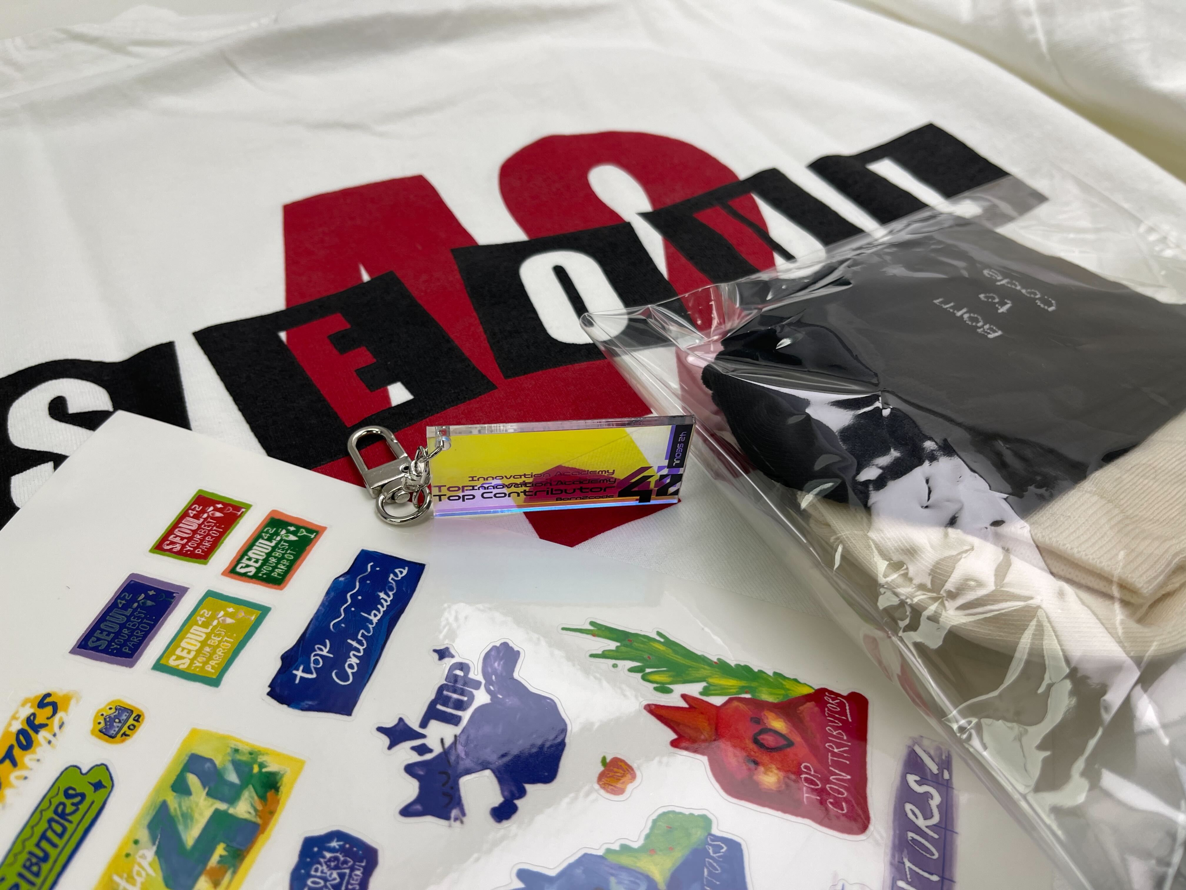 상으로 받는 것중에 많은 사람들에게 받은 축하만큼 좋은 것은 없지만, 그래도 부상도 꽤나 좋은 것들만 받았다. 양말, 스티커, 42서울 옷 등등을 받았지만 그 중에 가장 좋았던 것은 중앙에 있는 Top Contributor 뱃지였다. 뭔가 어깨를 올려주는 매력이 있달까.. 바로 받자마자 이 뱃지만큼은 가방에 달아두었다. 나중에 누가 내 가방을 봐도 이 가방은 탑 컨트리뷰터의 것이라는 것을 알도록..