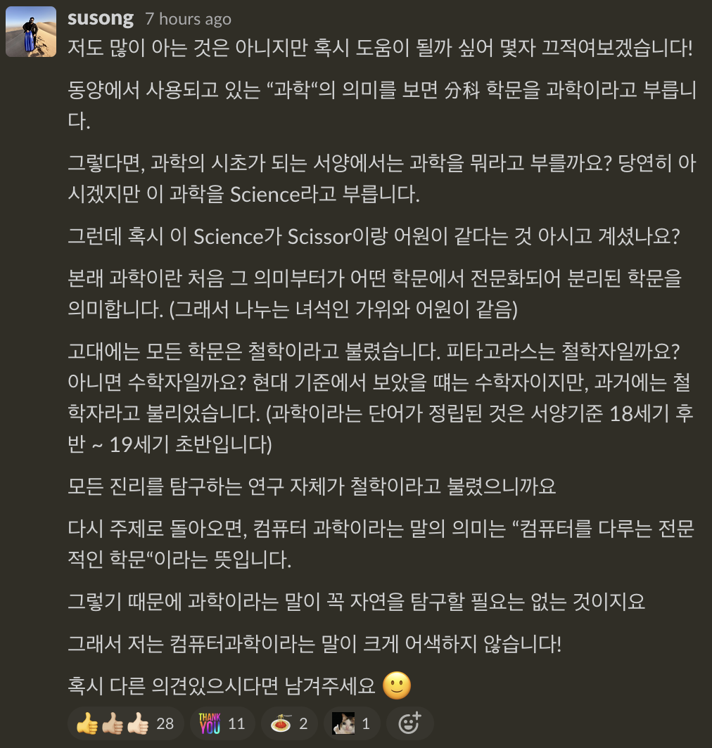 컴퓨터과학은 '컴퓨터에 대한 전문적인 지식'이기에 과학이라고 부를 수 있다!가 된다.
